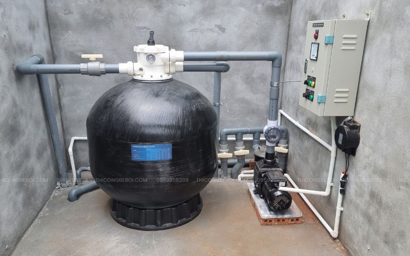 Bể bơi được trang bị bình loc Minder D900 với lưu lượng 30m³/h và máy bơm nước Minder giúp tuần hoàn nước mạnh, ổn định và vận hành êm ái trong suốt quá trình hoạt động. Hệ thống xử lý nước sử dụng điện phân muối Laswim HQ/SQ, tạo clo tự nhiên, an toàn cho da và không gây mùi.