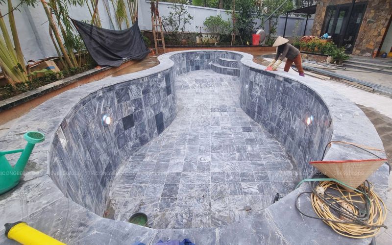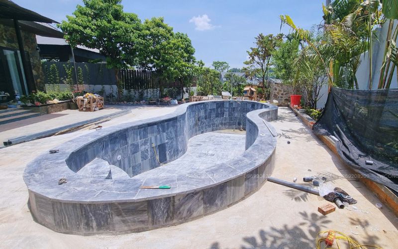 Lòng và thành bể được ốp đá tự nhiên, mang lại hiệu ứng màu nước hài hòa, cảm giác gần gũi với thiên nhiên và phù hợp với cảnh quan đặc trưng của khu vực Ba Vì. Thiết kế này vừa đảm bảo yếu tố thẩm mỹ, vừa giữ được vẻ ổn định cho bể trong quá trình sử dụng lâu dài.