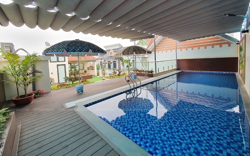 Bể bơi được thiết kế hình chữ nhật truyền thống, vừa mang tính thẩm mỹ vừa tiện lợi trong khâu thi công và vận hành, phù hợp với khuôn viên sân vườn xanh mát của gia đình. Kích thước hợp lý giúp tối ưu hóa hiệu suất lọc nước, tiết kiệm chi phí bảo trì, đồng thời tạo không gian rộng rãi, thuận tiện cho cả gia đình thư giãn và vận động.