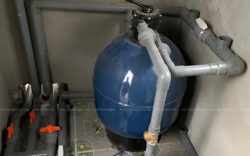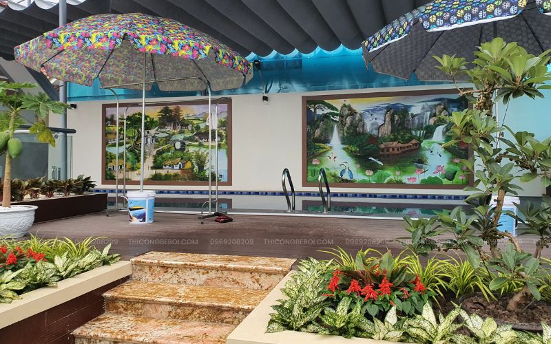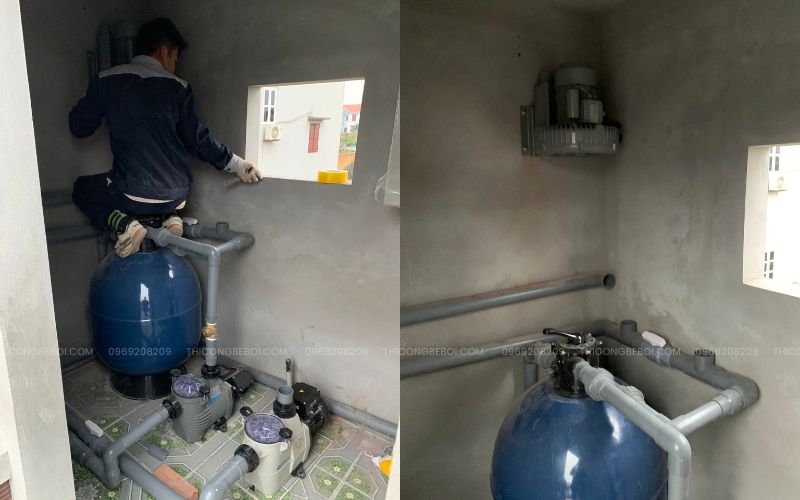 Ngoài ra, bể còn được trang bị các phụ kiện tiện ích như máng thu nước tràn, thang inox và phòng máy kỹ thuật bố trí khoa học, giúp quá trình vận hành, bảo dưỡng trở nên dễ dàng và thuận tiện cho chủ nhà.
