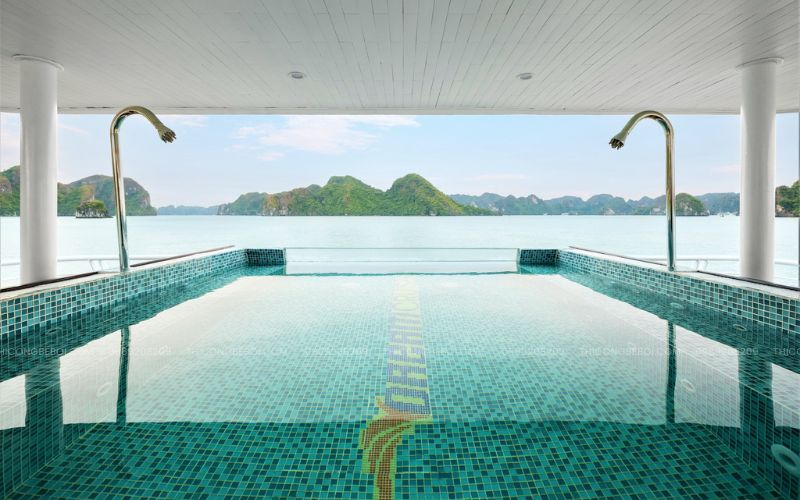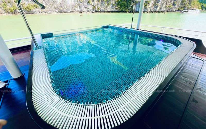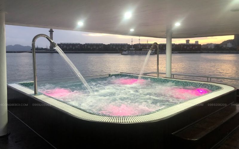 Bể sục được bố trí tại tầng 2, khu vực mũi tàu – vị trí có tầm nhìn mở rộng ra biển, cho phép du khách vừa thư giãn trong làn nước ấm vừa tận hưởng trọn vẹn không gian thiên nhiên. Với diện tích khoảng 10m², công trình được thiết kế gọn gàng nhưng vẫn đảm bảo trải nghiệm cao cấp đúng chuẩn du thuyền 5 sao.