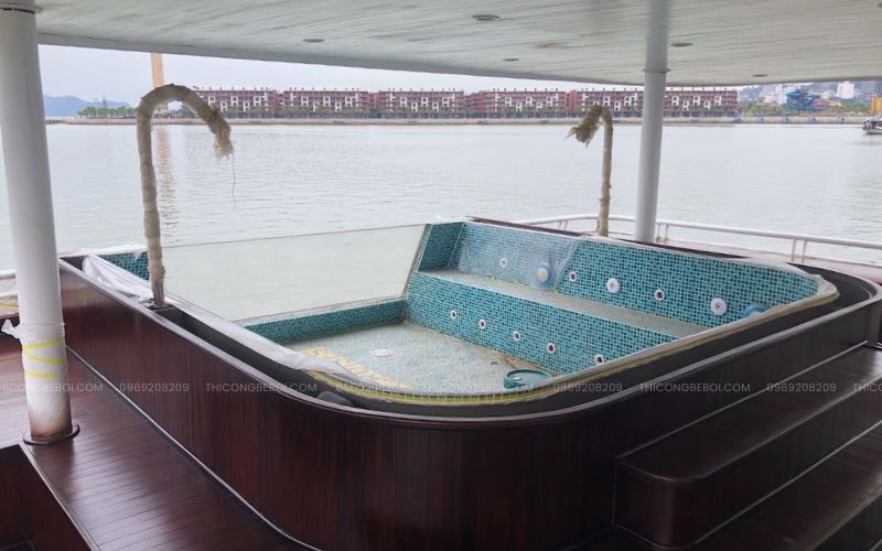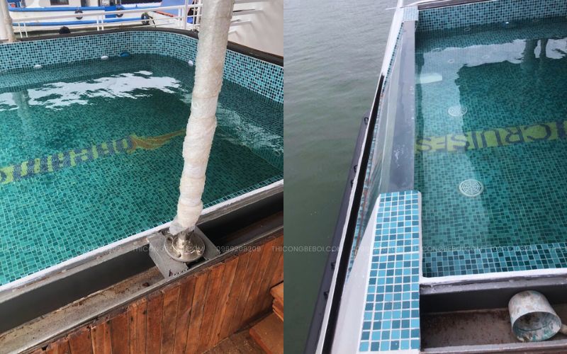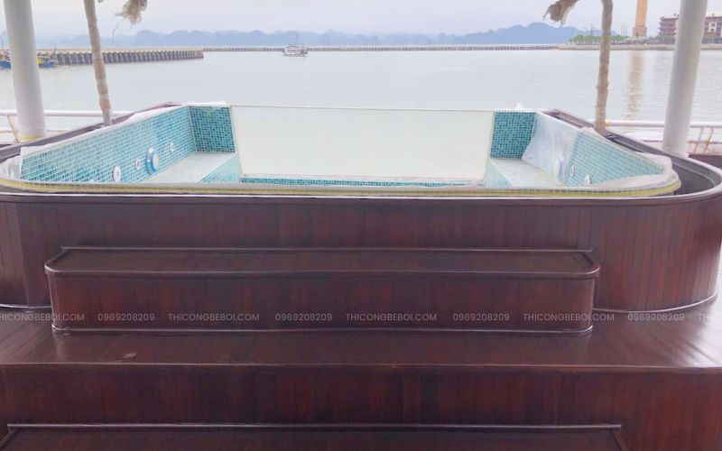 Lòng bể được hoàn thiện bằng gạch mosaic thủy tinh cao cấp, phối màu hài hòa và in logo thương hiệu du thuyền, vừa đảm bảo độ bền vừa tăng giá trị nhận diện. Khu vực viền bể sử dụng sàn gỗ chuyên dụng ngoài trời, có khả năng chống trơn trượt, chống thấm và thích nghi tốt với môi trường biển.