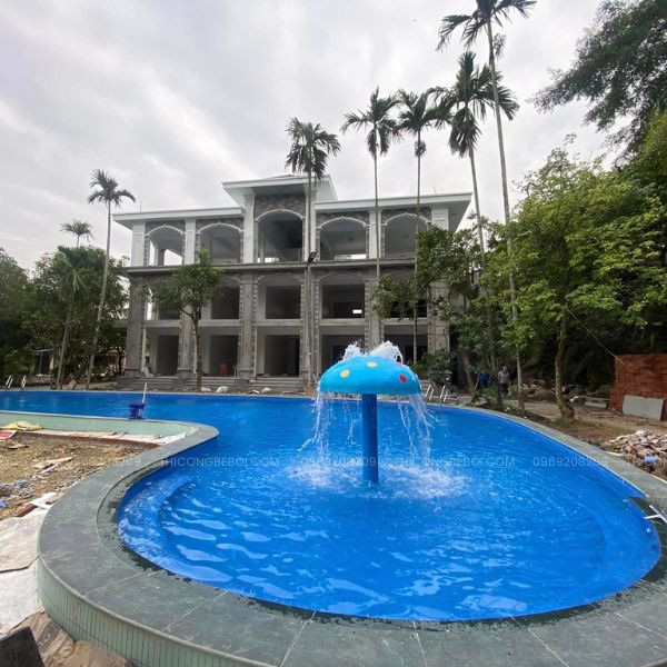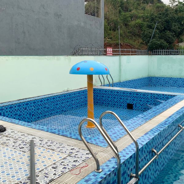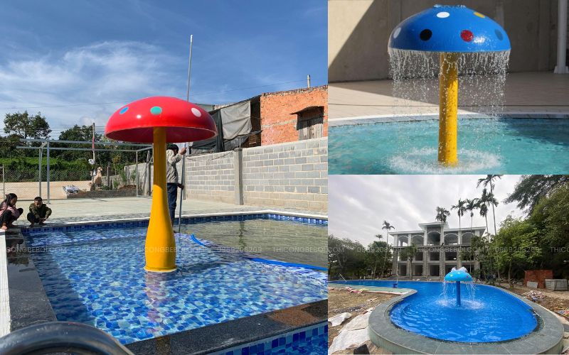 Thiết kế của cây nấm gồm hai phần chính: thân nấm và mũ nấm dạng vòm tròn. Bên trong thân là ống dẫn trung tâm kết nối với hệ thống vòi phun đặt ẩn dưới mũ nấm. Khi máy bơm hoạt động, nước được đẩy lên đỉnh rồi tỏa đều theo vành mũ, tạo hiệu ứng thác nước hình vòm liền mạch, mềm mại và vô cùng cuốn hút. Đây là điểm nhấn giúp không gian bể bơi trở nên sinh động và vui nhộn hơn, mang lại trải nghiệm thú vị cho cả trẻ em và người lớn.