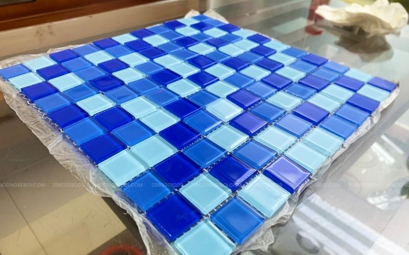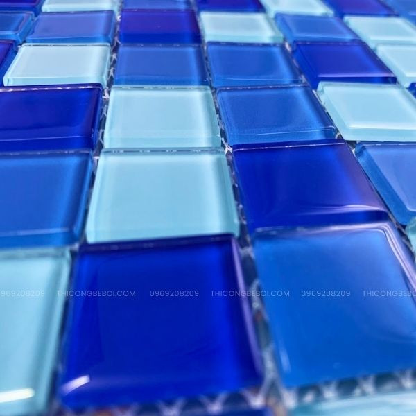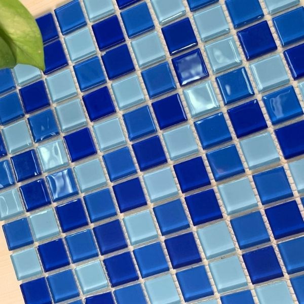 Với ưu thế về tính linh hoạt trong thi công và hiệu ứng thẩm mỹ cao, gạch mosaic thủy tinh trộn 3 màu xanh viên 25×25mm thường được sử dụng song song với dòng viên lớn, đặc biệt trong các công trình bể bơi và bể sục cần xử lý nhiều chi tiết cong hoặc điểm nhấn trang trí tinh tế.