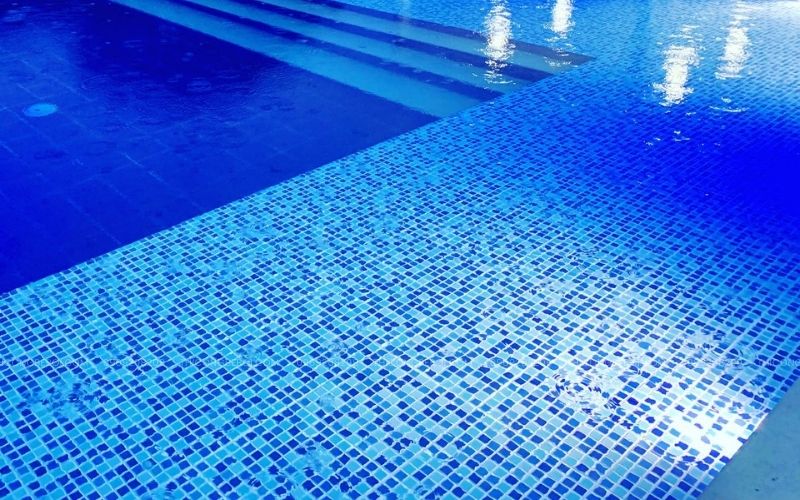 Sản phẩm được làm từ thủy tinh ép nhiệt, bề mặt bóng mịn và có khả năng phản xạ ánh sáng tốt. Khi kết hợp với hệ thống đèn dưới nước, các viên mosaic nhỏ tạo hiệu ứng ánh nước lấp lánh rõ nét hơn, mang lại cảm giác chuyển động nhẹ nhàng và tăng chiều sâu cho bể bơi hoặc bể sục.