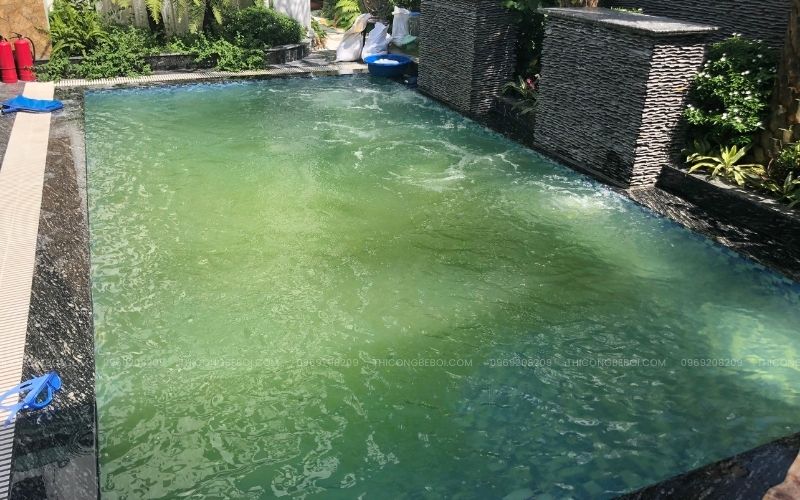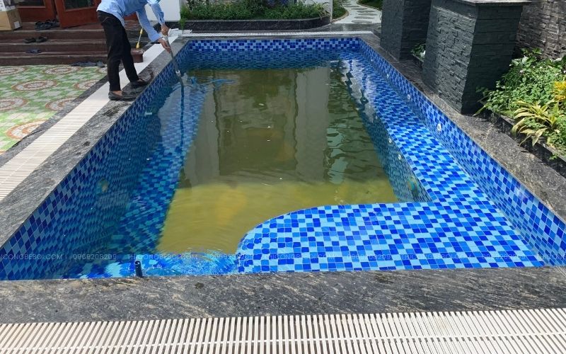 Đổ dung dịch PAC đã pha đều khắp bể, sau đó bật hệ thống bơm tuần hoàn trong 1–2 giờ để hóa chất phân tán đều. Khi phản ứng xảy ra, các cặn bẩn sẽ dần kết tủa và lắng xuống đáy. Tắt hệ thống lọc, để nước yên trong 1–2 giờ rồi tiến hành hút vệ sinh đáy bể.