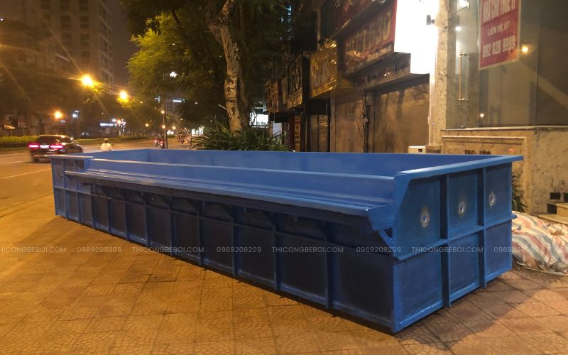 Toàn bộ bể bơi được Tân Tiến gia công hoàn chỉnh tại xưởng theo số liệu đo đạc thực tế, bao gồm tạo hình bể, hoàn thiện bề mặt và khoan sẵn các vị trí kỹ thuật chờ. Sau khoảng 15 ngày sản xuất, bể được vận chuyển nguyên khối đến công trình và cẩu trực tiếp lên tầng 12 bằng thiết bị chuyên dụng, đảm bảo chính xác và an toàn tuyệt đối.