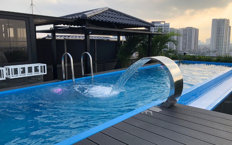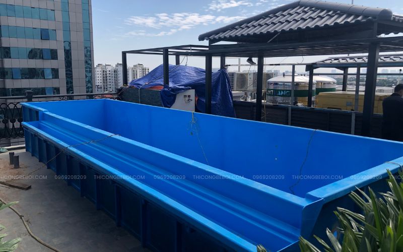 Sau khi định vị bể tại vị trí lắp đặt, đội ngũ kỹ thuật tiến hành hoàn thiện phần yếm bằng sàn nhựa giả gỗ, giúp tổng thể công trình trở nên gọn gàng, sang trọng và hài hòa với không gian sân thượng. Ưu điểm lớn của phương án này là hạn chế tối đa bụi bẩn, vật liệu xây dựng và không làm ảnh hưởng đến sinh hoạt của gia đình trong suốt quá trình thi công.