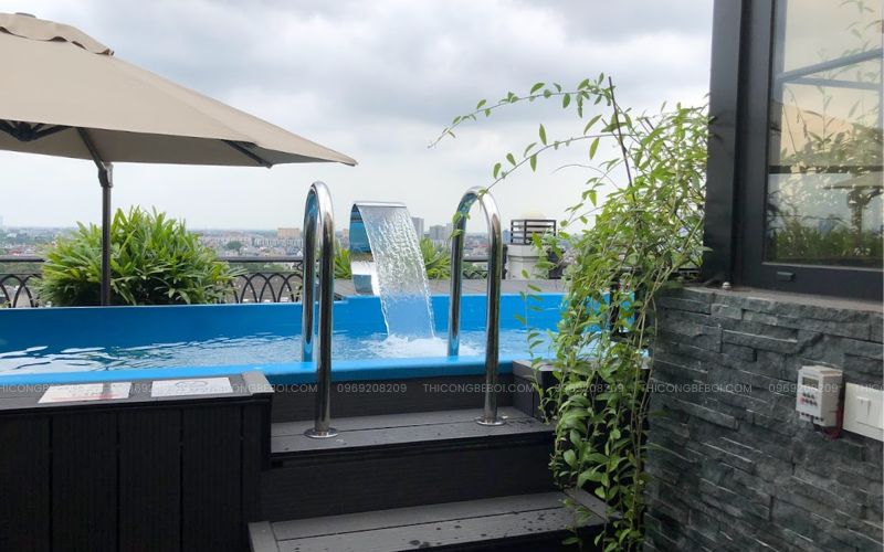 Ngoài công năng bơi lội cơ bản, bể còn tích hợp thác nước inox và cây phun massage mỏ vịt, mang lại trải nghiệm thư giãn nhẹ nhàng ngay tại nhà. Các chi tiết như thang bể bơi, đầu trả nước và phụ kiện được lắp đặt gọn gàng, tối ưu không gian sử dụng nhưng vẫn đảm bảo an toàn và tiện lợi.