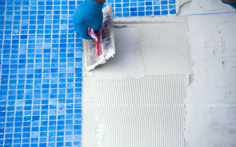 Ở bước này, keo dán gạch sẽ được trải đều lên bề mặt tường hoặc đáy bể bơi bằng bay răng cưa. Độ dày của lớp keo thường dao động khoảng 2–3 mm để đảm bảo độ bám dính tốt nhất.