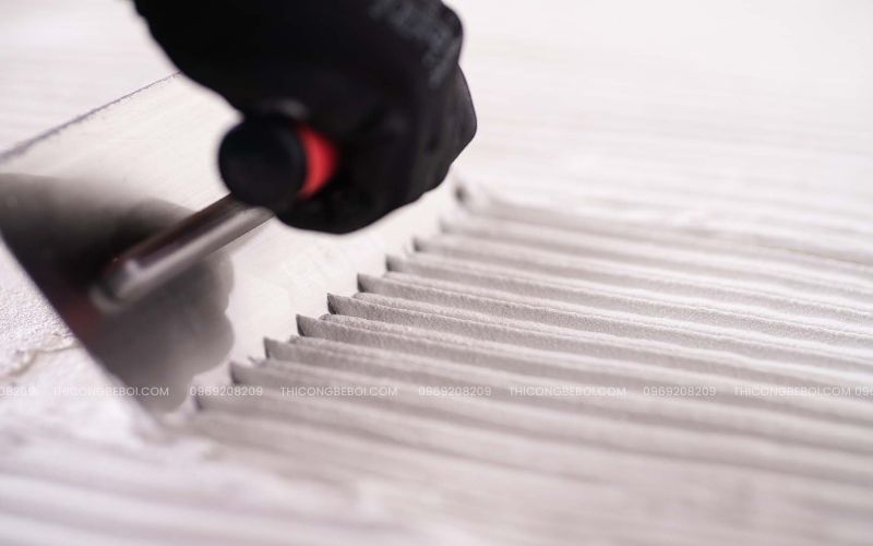 Việc tạo rãnh keo bằng bay răng cưa giúp lớp keo phân bố đồng đều, đồng thời tăng diện tích tiếp xúc giữa gạch và bề mặt thi công. Nếu keo được trải không đều, bề mặt gạch sau khi hoàn thiện có thể bị mấp mô hoặc không thẳng hàng. Chính vì vậy, công đoạn này đòi hỏi sự cẩn thận và tỉ mỉ từ người thi công.