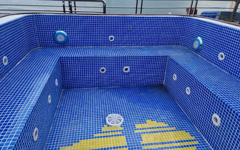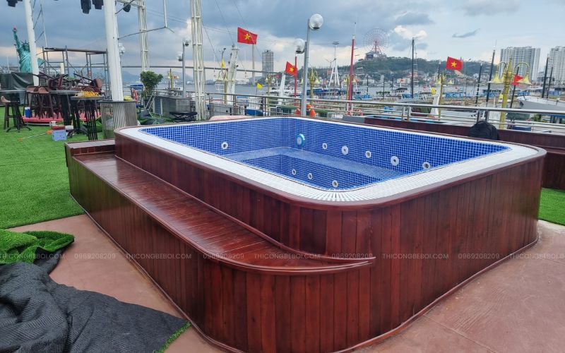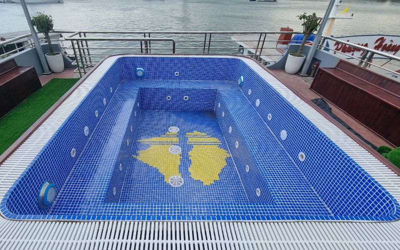 Phần thân bể được ốp yếm gỗ kỹ thuật, vừa che chắn toàn bộ hệ thống kỹ thuật bên trong, vừa tạo điểm nhấn thẩm mỹ sang trọng, hài hòa với tổng thể thiết kế của tàu. Lòng bể hoàn thiện bằng gạch mosaic, đảm bảo khả năng chống trơn trượt, dễ vệ sinh và duy trì độ bền cao trong điều kiện nắng gió, độ ẩm và hơi muối biển.