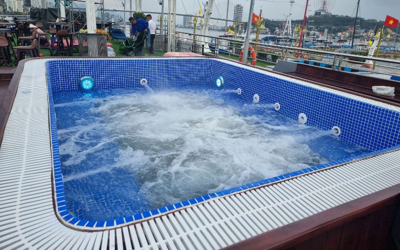 Không gian bên trong bể được bố trí 6 vị trí sục xung quanh, kết hợp bậc ngồi cao khoảng 40cm, tạo tư thế ngồi ngâm thoải mái, vững chắc và phù hợp với nhiều đối tượng du khách. Cách bố trí này giúp người sử dụng dễ dàng thư giãn, tận hưởng trọn vẹn hiệu quả massage nước ngay cả khi tàu đang di chuyển.