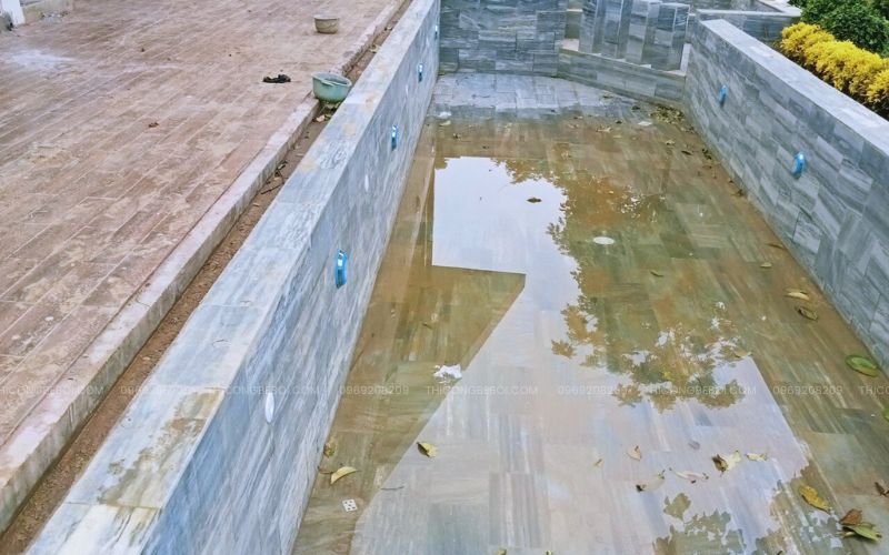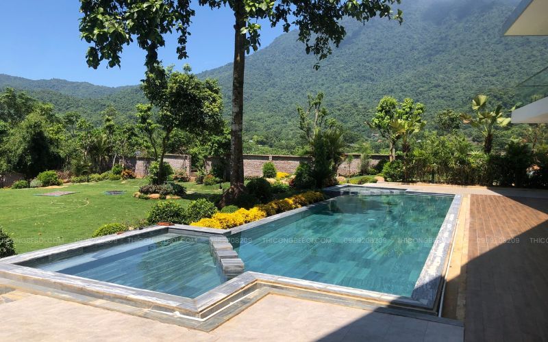 Bể bơi chính được xây dựng với dung tích 60m³, thiết kế hài hòa theo phong cách tự nhiên. Toàn bộ thành – đáy bể được chống thấm kỹ thuật nhiều lớp và ốp đá tự nhiên tông trầm, giúp không gian trở nên hiện đại, tinh giản và phù hợp với cảnh quan xanh mát xung quanh.