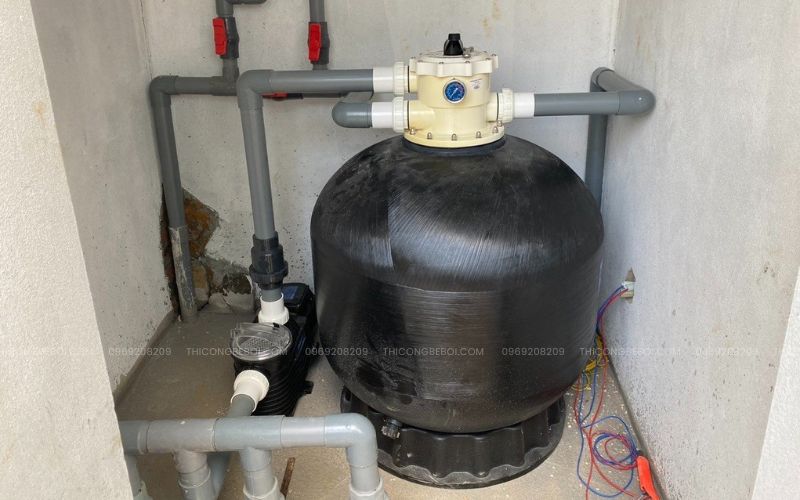 Hệ thống thiết bị của công trình được lựa chọn với tiêu chí bền bỉ và phù hợp tuyệt đối với quy mô 60m³. Nổi bật là bộ lọc cát Minder D800 lưu lượng 25m³/h, cho phép toàn bộ nước hồ được tuần hoàn trong khoảng 3 giờ. Hiệu suất này giúp duy trì chất lượng nước ổn định, hạn chế rong rêu và đảm bảo bể luôn trong xanh khi vận hành.