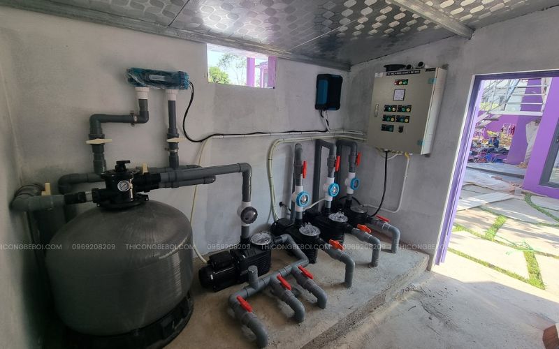Bể sử dụng hệ thống bơm lọc cát, được lựa chọn phù hợp với dung tích bể và nhu cầu sử dụng của gia đình, giúp nước luôn được tuần hoàn và duy trì chất lượng ổn định.