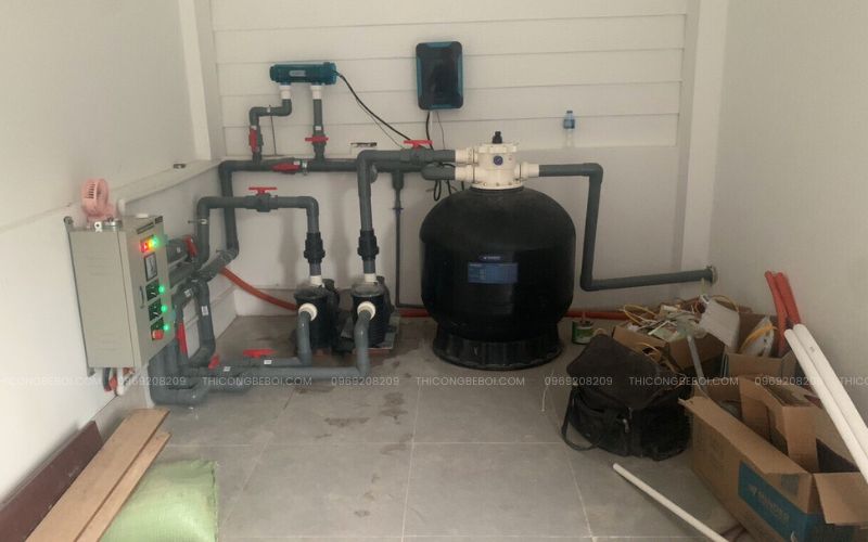 Công trình được chú trọng đầu tư hệ thống thiết bị vận hành nhằm đảm bảo chất lượng nước ổn định và an toàn trong suốt quá trình khai thác. Bể bơi sử dụng bình lọc Minder D800 với lưu lượng 25 m³/h, đáp ứng tốt nhu cầu lọc nước và duy trì độ trong sạch cho bể vô cực ngoài trời.