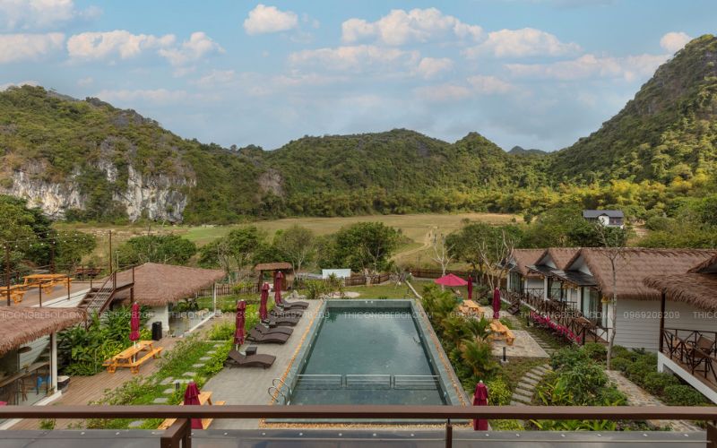 Giữa không gian thung lũng xanh mát của Yên Valley Cát Bà, bể bơi vô cực được bố trí tại vị trí trung tâm khu homestay, mở ra tầm nhìn thoáng rộng bao trọn cảnh quan xung quanh. Công trình không chỉ đóng vai trò là tiện ích thư giãn mà còn trở thành điểm nhấn kiến trúc nổi bật, góp phần định hình phong cách nghỉ dưỡng riêng cho toàn bộ khu lưu trú.