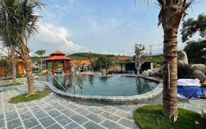 Sau khi hoàn thiện và đưa vào sử dụng, bể bơi nhanh chóng trở thành không gian sinh hoạt chung của toàn khu homestay. Thiết kế uốn lượn mềm mại, kết hợp ánh sáng buổi tối và các tiện ích đi kèm giúp bể bơi không chỉ phục vụ nhu cầu bơi lội, mà còn là nơi khách dừng chân, thư giãn và tận hưởng không khí điều hòa trong lành, không gian gần gũi với thiên nhiên.